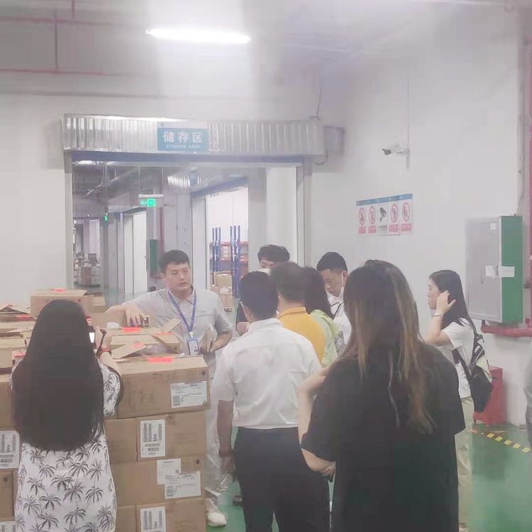 工作人員帶領(lǐng)考察團(tuán)參觀入駐企業(yè)的倉(cāng)儲(chǔ)區(qū),了解倉(cāng)儲(chǔ)運(yùn)營(yíng)流程。